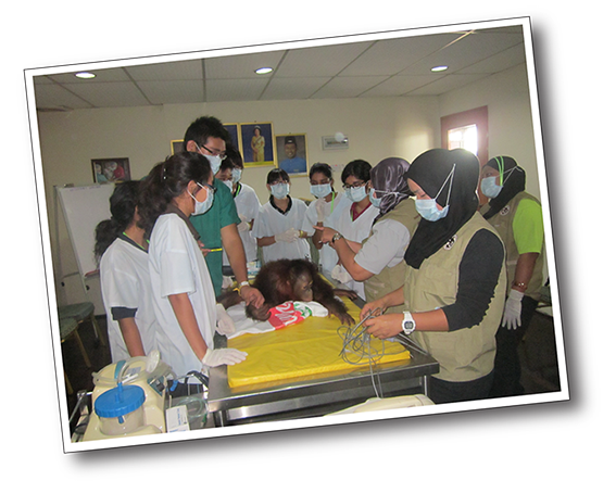 Veterinary students undergo a training programme that involves clinical diagnosis and treatment, where they receive training in veterinary medicine, in the management of the ICU, in the special management of orangutans, and, in pediatric medicine.